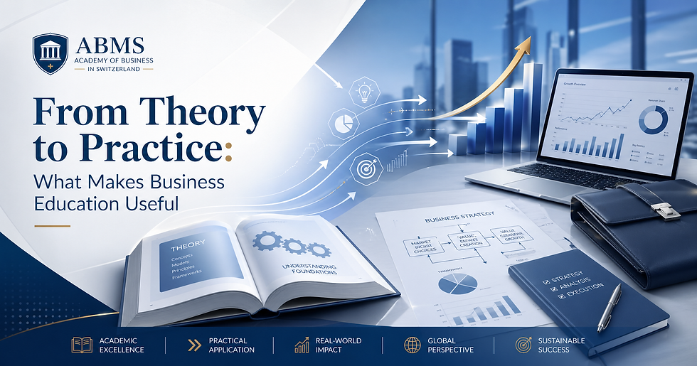 At ABMS Academy of Business in Switzerland, previously known as ABMS OPEN UNIVERSITY OF SWITZERLAND® and founded in 2013, the value of business learning is closely linked to practical understanding. Students today need more than memorized definitions. They need to know how to think, analyze, communicate, and act with confidence in changing professional environments.